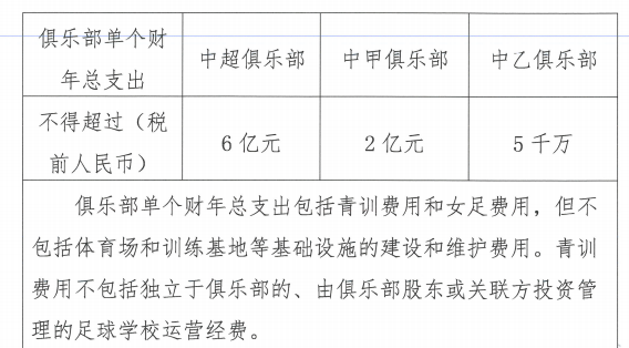 率先是在总开销名额上,中超俱乐部单个财年总开销不得普及6亿元(税前),中甲不得普及2亿元(税前),中乙不得普及5千万元(税前)。总开销包括青训用度和女足用度,但不括领路场和试验基地等基础轨范的栽种和惊叹用度。青训用度不包括寂寥于俱乐部的、由俱乐部鼓舞或关联方投资管里的足球学校运营经费。