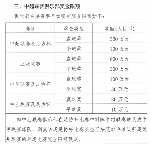 在单场奖金名额方面,中超联赛的单场赢球奖金不得普及税前300万元,平球奖金不得普及税前100万元。亚冠联赛单场赢球奖金不得普及税前600万元,平球奖金不得普及税前200万元。中甲联赛及足协杯单场赢球奖金不得普及税前100万元,平球奖金不得普及税前30万元。中乙联赛及足协杯单场赢球奖金不得普及税前30万元,平球奖金不得普及税前10万元。